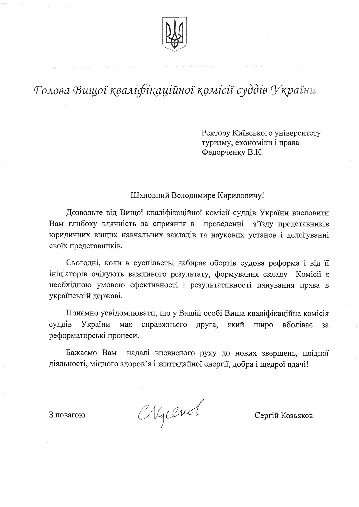 Teachers of the Law Faculty of Kyiv University of Tourism, Economics and Law (Fedorchenko N.V., Dolyanovskaya I.M., Maksimova L.O.) participated in the congress of representatives of legal higher educational institutions and scientific institutions in the election of heads of the High Qualifications Commission judges of Ukraine.Within the framework of the event, the election of the leaders of the High Qualifications Commission of Judges of Ukraine took place. The event's organizers expressed their sincere gratitude to the rector of the university with the assistance of the congress.