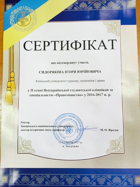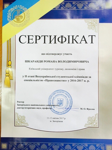 11-13 April 2017 at Zaporizhzhya National University held a second round of Ukrainian Student Olympiad in the direction of "Law", uniting 142 delegated representatives from 50 leading higher legal educational institutions in Ukraine. From Kyiv University of Tourism, Economics and Law were students Shkaranda Roman and Sydoryakin Igor. Students are proud of the honor to represent the University at the Olympics and say - "We first participated in the Olympics this level, although participated scientific competitions and conferences." After adding that the task was not easy answers require not only knowledge of codes, but also the relevant regulations. So they believe that strive to adequately represent our university.
