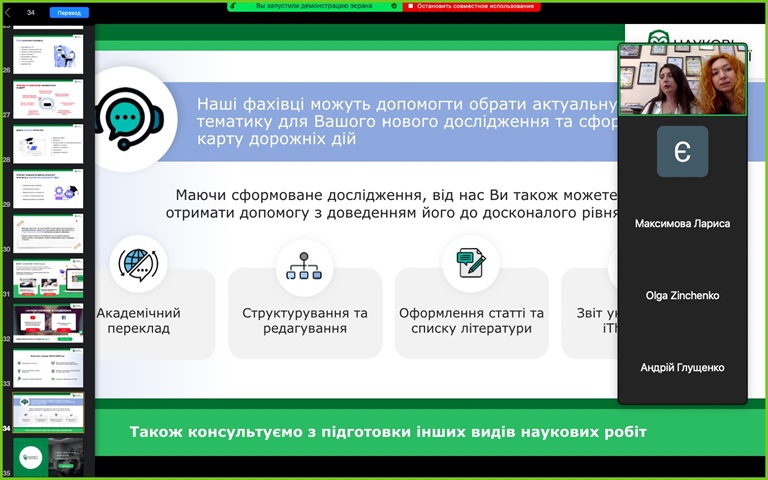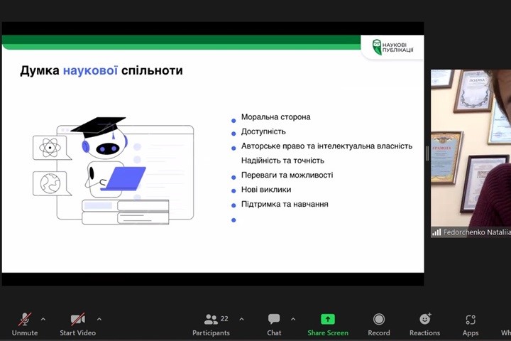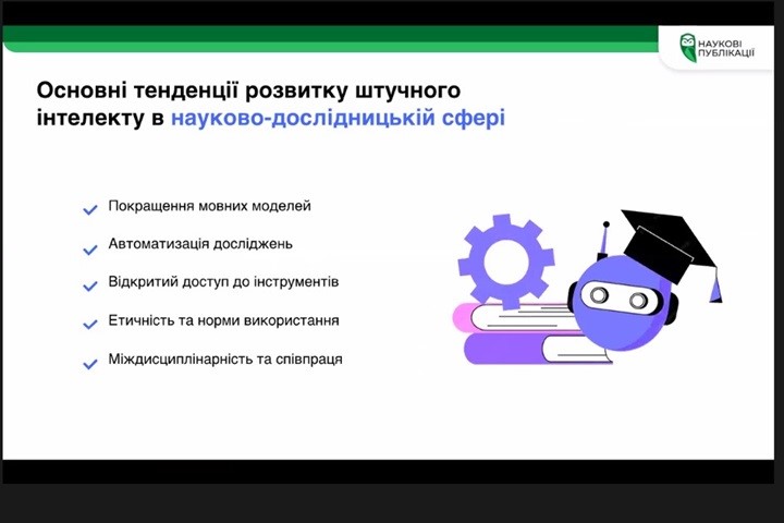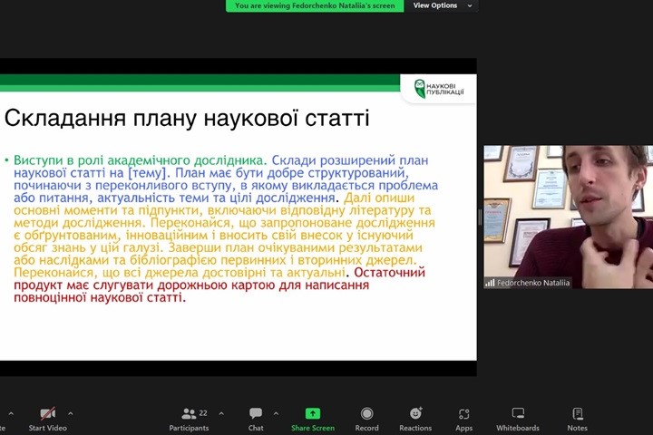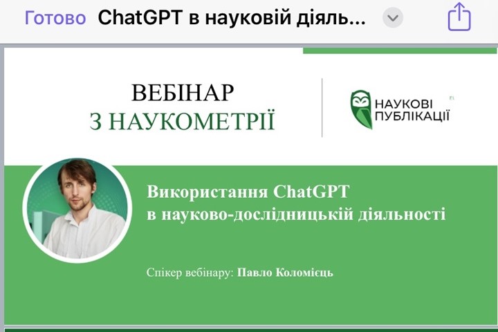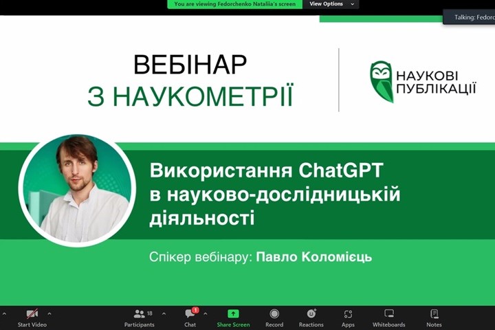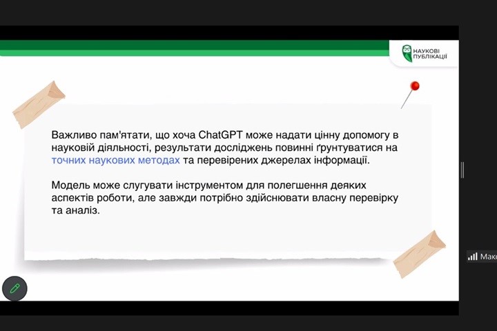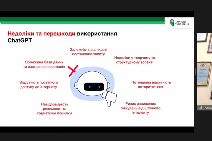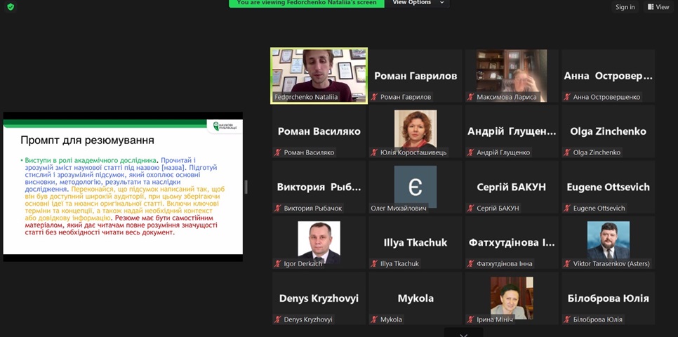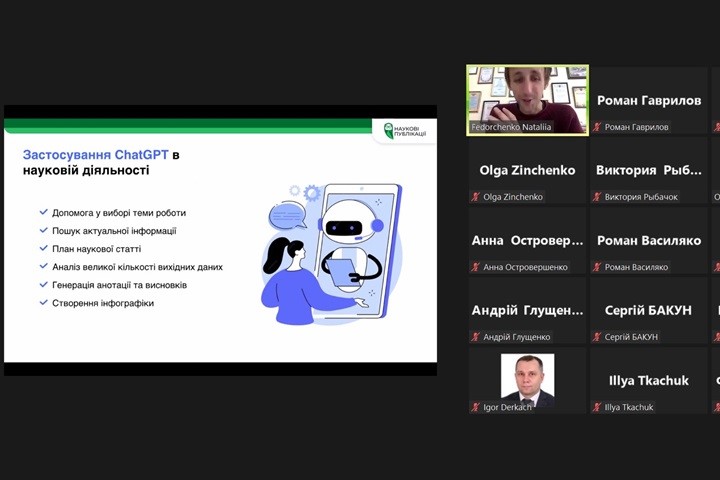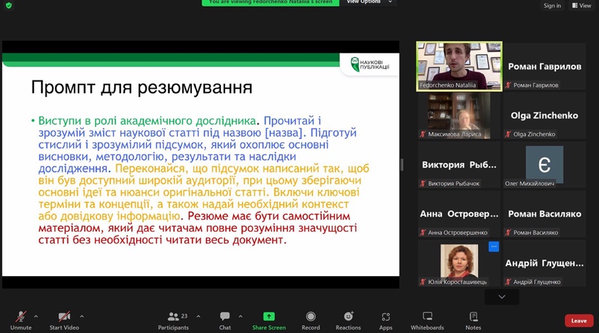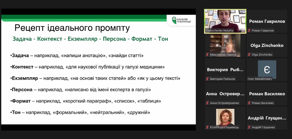 Директор Науково-навчального центру компанії «Наукові публікації» Помін Аліна та спікер Коломієць Павло розповіли про допомогу Chat GPT на всіх етапах написання статті; недоліки використання Chat GPT; спеціальні промпти для вчених; основні тенденції розвитку штучного інтелекту.