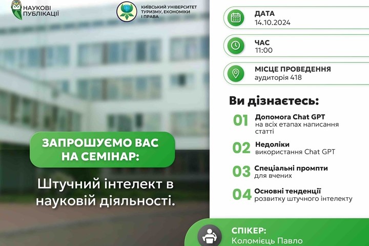 14 жовтня 2024 року для викладачів, магістрів КУТЕП та аспірантів Інституту правотворчості та науково-правових експертиз НАН України, був проведений практичний семінар на тему «Штучний інтелект в науковій діяльності».
